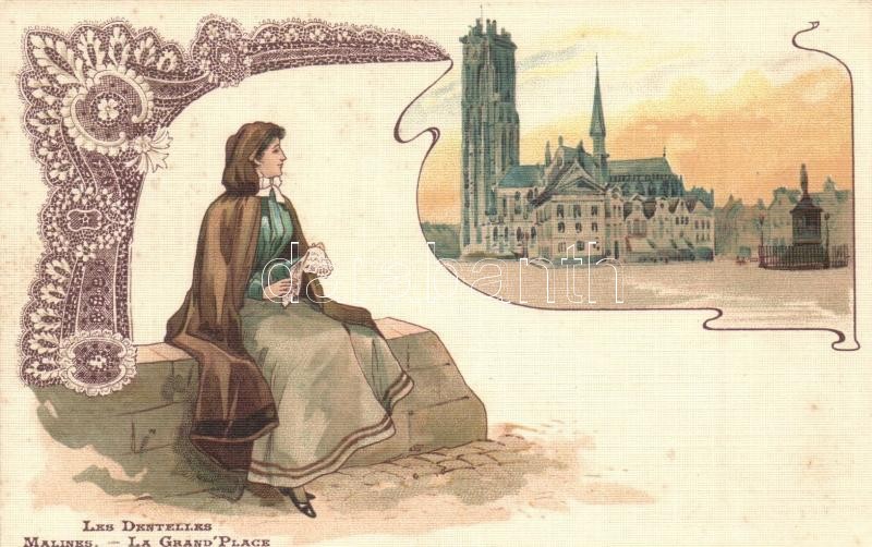 Mechelen, Malines; Les Dentelles, La Grand Place / square. Art Nouveau, floral, lady, litho