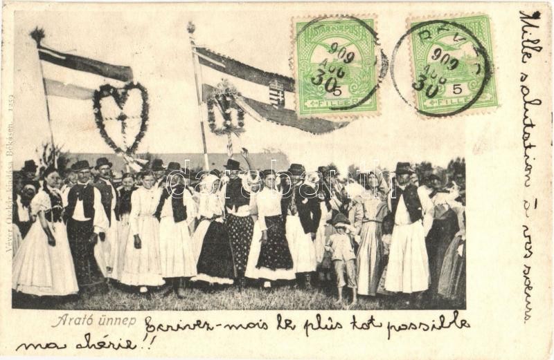 Békés, Arató ünnep Békésen, címeres magyar zászló, folklór. Véver Oszkár kiadása, TCV card (EK)