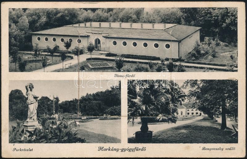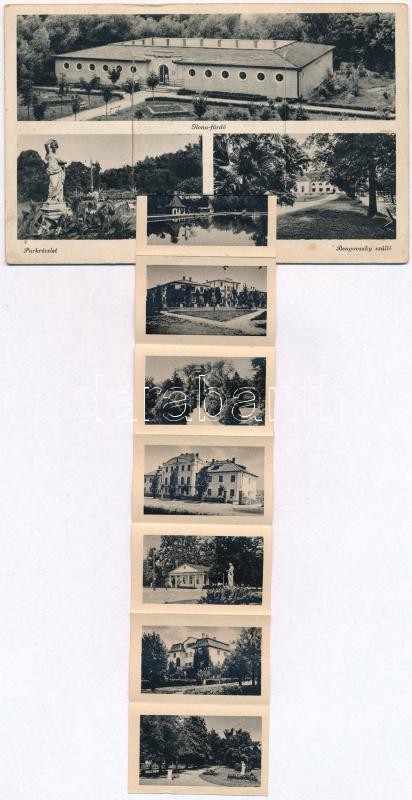Harkány, Ilona fürdő, Park, Benyovszky szálloda. leporellólap, belül: Török villa, Rudolf ház, Kápolna, Vasutasház, Strand, OTI üdülő (EK)