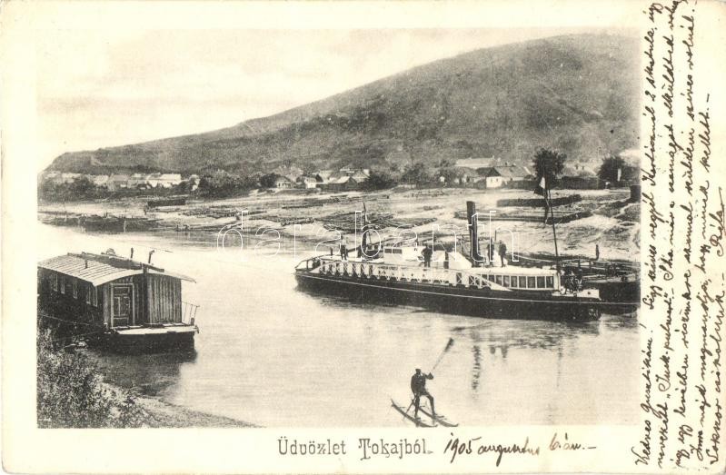 Tokaj, Tisza part, gőzhajó, lakóhajó, férfi egy vízi járművel (amit ké...