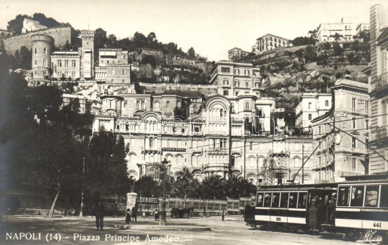 Naples, Napoli; Piazza Principe Amedeo, G. Eden Hotel / square with tram