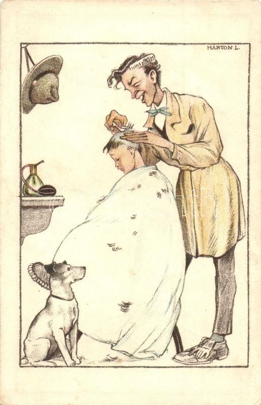 Cserkész fodrász. Kiadja a Magyar Cserkészszövetség Nagytábortanácsa 1926. / Scout boy hairdresser, art postcard. s: Márton L. (EK)