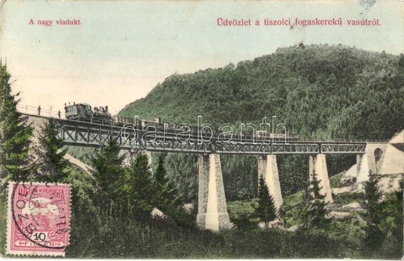 Tiszolc, Tisovec; Tiszolc-völgyi fogaskerekű vasút Breznóbánya és Tiszolc között, iparvasút, gőzmozdony, híd, viadukt. Morvai Sámuel kiadása / standard gauge cogwheel railway between Brezno nad Hronom and Tisovec, industrial railway viaduct, locomotive, bridge. TCV card (EK)