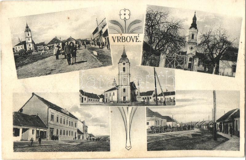 Verbó, Vrbové; Fő tér, Ferde torony, utcakép, piac, üzletek, templomok. A. Slavik kiadása / main square, bell tower, street view, shops, market, churches. Art Nouveau