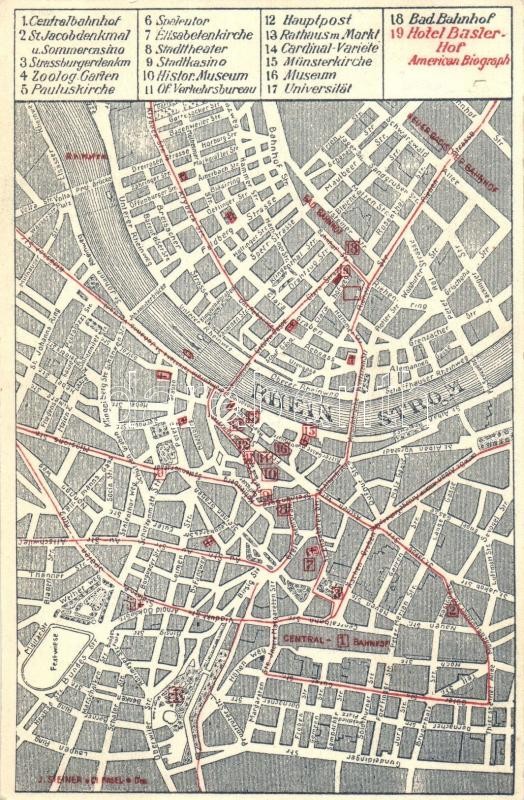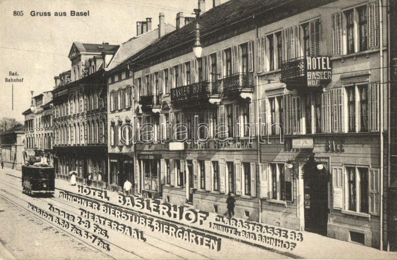 Basel, Hotel Baslerhof, Münchner Bierstube Oskar Turke. Clarastrasse 88. / hotel, tram, beer hall, restaurant, inn, map on the backside