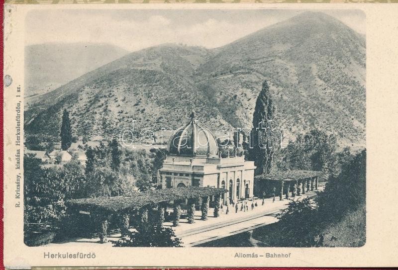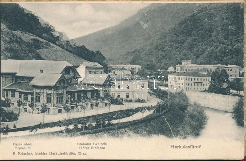 Herkulesfürdő, Baile Herculane; 12 lapos leporellofüzet, belül: vasútállomás, Livia villa, Stefánia szálloda, Dalszínház, Gyógyterem, stb. R. Krizsány kiadása / leporello booklet with 12 cards, inside: railway station, villas, hotel, orpheum, spa hall, etc.