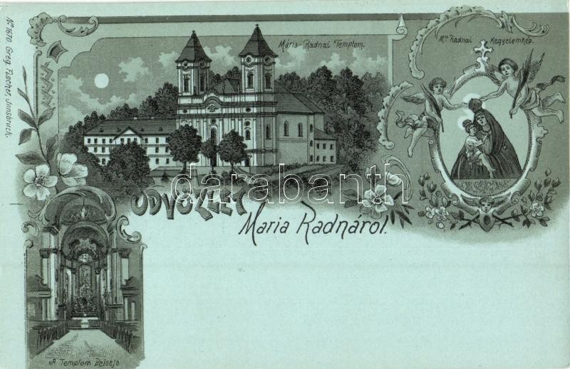 Máriaradna, Radna; Kegytemplom, Kegyelemkép, Templom belső. Greg. Fischer No. 1670. / pilgrimage church, altar, interior. Art Nouveau, floral, litho