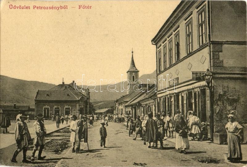 Petrozsény, Petrosani; Fő tér, piac, üzletek, templom. W. L. 1679. / main square, market, shops, church (EK)