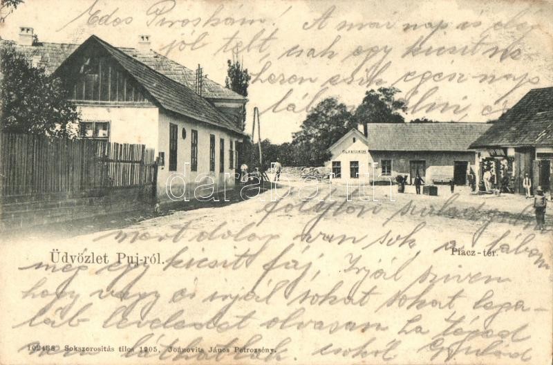 Puj, Pui; Piac tér, Olvasókör, Papp üzlete. Joánovits János kiadása / market square, shops, reading club