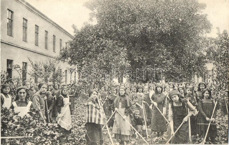 Description: Temesvár, Timisoara; Iskola Nővérek Intézete, Gazdasági részlet, hölgyek a kertben kapával, ásóval, gereblyével / school nurses institute, girls in the garden with shovels, spades, etc.