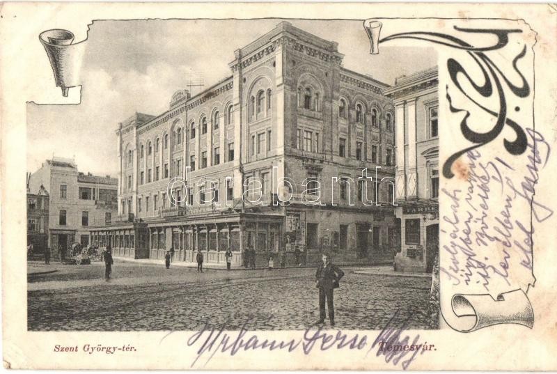 Description: Temesvár, Timisoara; Szent György tér, takarékpénztár, Biztosító társaság, étterem és kávéház. Divald Károly 761. / square, savings bank, cafe, restuarant Art Nouveau (ázott / wet damage)