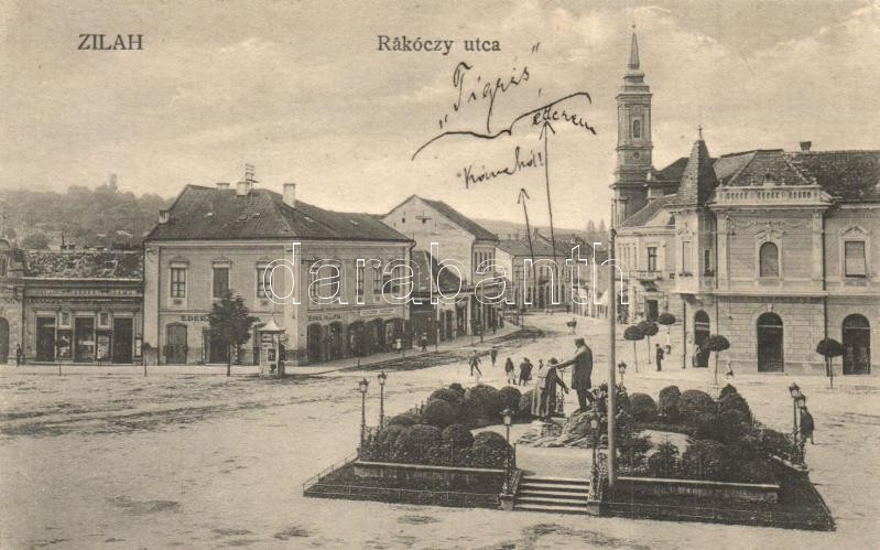 Zilah, Zalau; Rákóczi utca, Seres Lajos, Seres Samu, Éder M. és fia, Luczek József üzlete, Tigris szálloda, szobor. Seres Samu kiadása / street, shops, hotel, statue