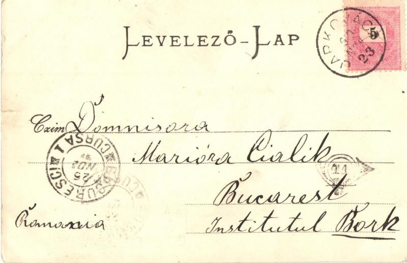 Description: 1899 Árkod, Jarkovatz, Jarkovác; Eisenbahn-Brücke, Serbische gr. or. Christi Himmelf.-Kirche / Vasúti híd, Szerb ortodox templom / railway bridge, Serbian Orthodox church. Art Nouveau, floral (fa)