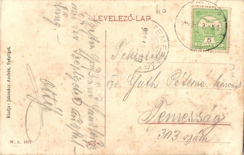 Description: Szépliget, Schönau, Gajdobra; Kálvária utca, Szépligeti Takarékpénztár Rt., templom. W. L. 1997. Kiadja Jakovácz András / street view, savings bank, church (EK)
