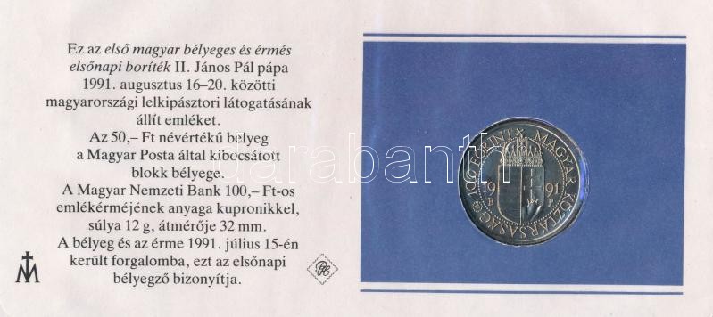 1991. 100Ft Cu-Ni "II. János Pál pápa látogatása Magyarországon" érmés borítékban, első napi bélyegzéssel, tájékoztatóval, eredeti műbőr tokban T:BU
