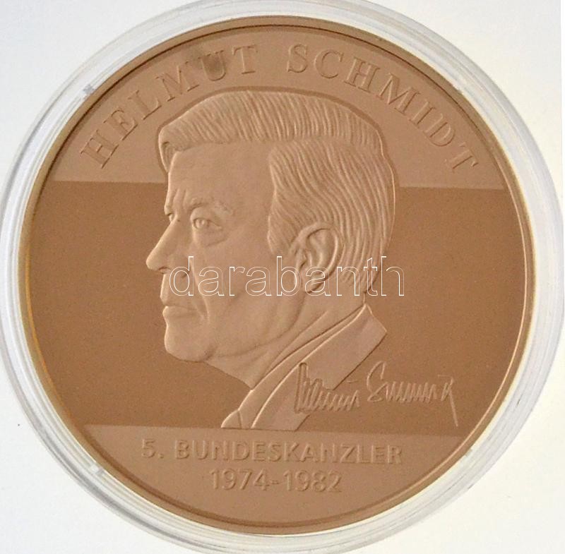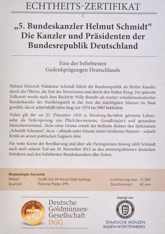 Németország DN "A Német Szövetségi Köztársaság kancellárjai és elnökei - Helmut Schmidt" aranyozott Cu-Ni emlékérem, német nyelvű tanúsítvánnyal T:PP Germany ND "Die Kanzler und Präsidenten der Bundesrepublik Deutschland - Helmut Schmidt" gilt Cu-Ni commemorative medallion with german language certificate C:PP