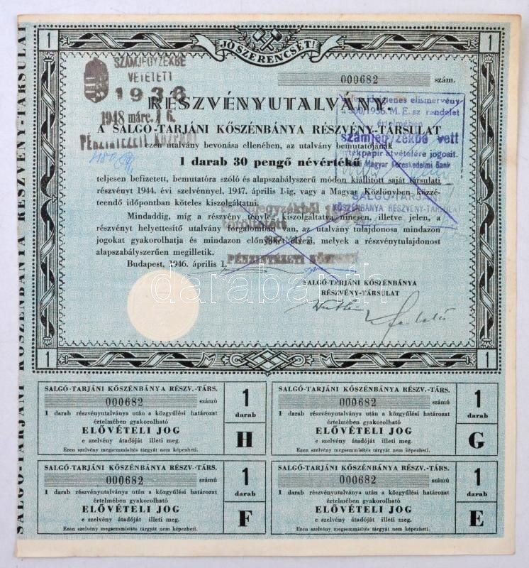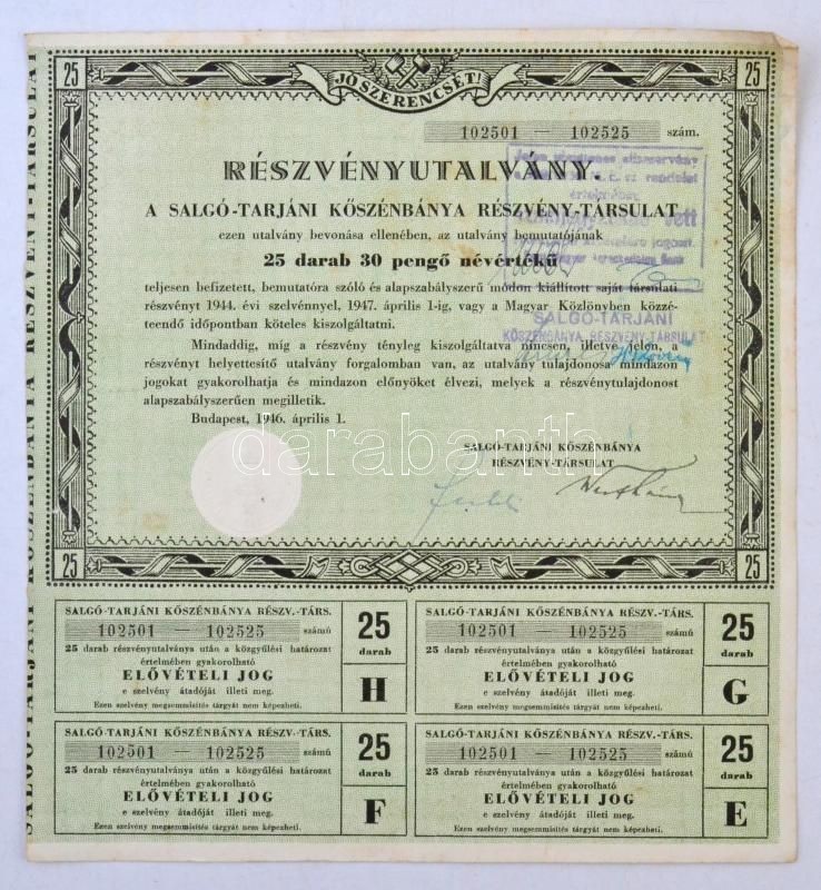 Budapest 1946. "Salgó-Tarjáni Kőszénbánya Részvény-Társulat" részvényutalványa 30P értékű részvényről, szárazpecséttel és bélyegzéssel, szelvényekkel + Budapest 1946. "Salgó-Tarjáni Kőszénbánya Részvény-Társulat" részvényutalványa huszonöt darab 30P értékű részvényről, szárazpecséttel és bélyegzéssel, szelvényekkel + Budapest 1946. "Salgó-Tarjáni Kőszénbánya Részvény-Társulat" részvényutalványa száz darab 30P értékű részvényről, szárazpecséttel és bélyegzéssel, szelvényekkel T:III
