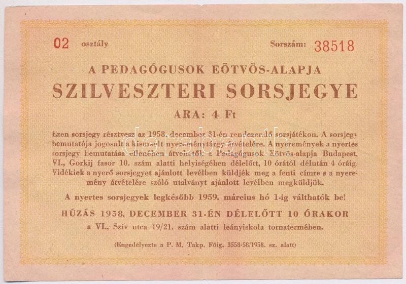 Budapest 1958. "A Pedagógusok Eötvös-alapja Szilveszteri Sorsjegye" 4Ft értékben T:II-,III