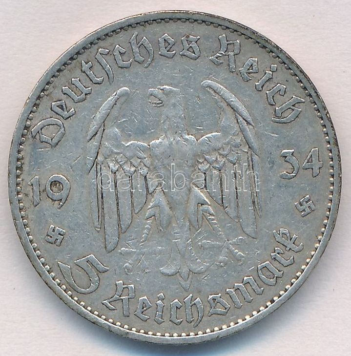 Német Harmadik Birodalom 1934A 5M Ag "Náci hatalom első évforduló... https://www.darabanth.com/en/323-Online-auction/323.0/Numismatics/Worldwide-silver-and-metal-coins~2000012/Nemet-Harmadik-Birodalom-1934A-5M-Ag-Naci-hatalom-elso-evforduloja-hatoldal-21-Marz-1933~II1794210