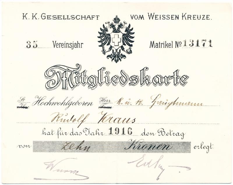 1916 Az Orsztrák Fehér Kereszt szövetség tagsági igazolványa
