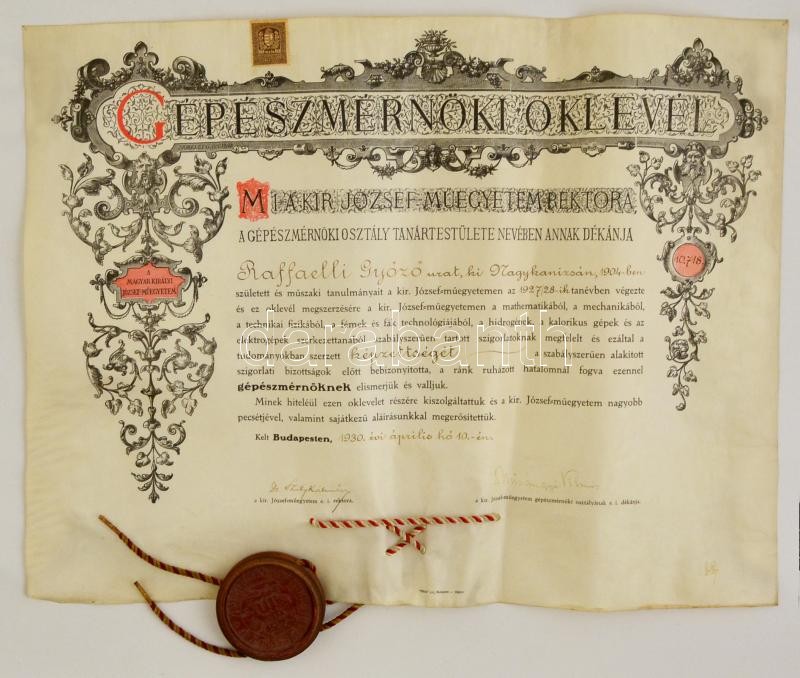 1930 A m. kir. József Műegyetem díszes gépészmérnöki oklevele, függőpecséttel, okmánybélyeggel