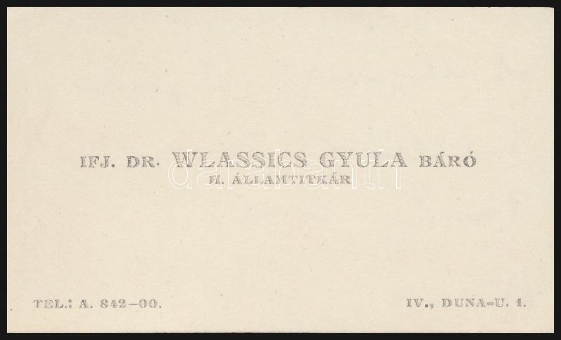 1930 Ifj. Dr. Wlassics Gyula báró államtitkár névjegykártyája, hátolda...