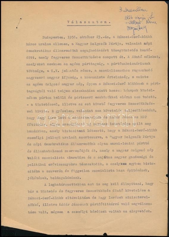 Description: 1956 Vas Zoltán (1903-1983) író, 56-os államminiszter, snagovi deportált Válaszúton c. 1956-os forradalommal foglalkozó cikke melyet egy román újság számára írt, de amely nem jelenhetett meg.