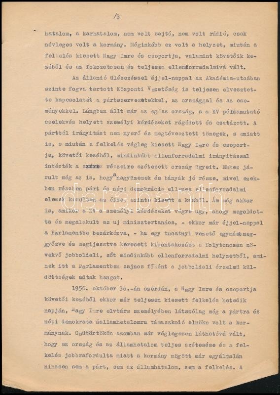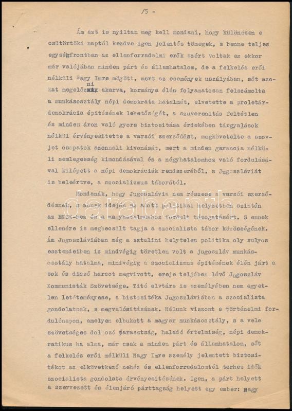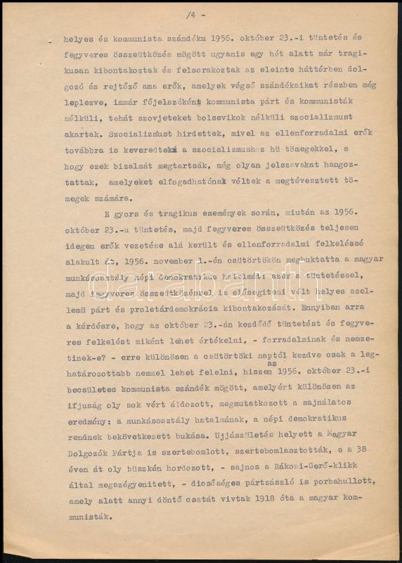 18 gépelt oldal, saját kezű feljegyzésekkel, utolsó oldal hiányzik