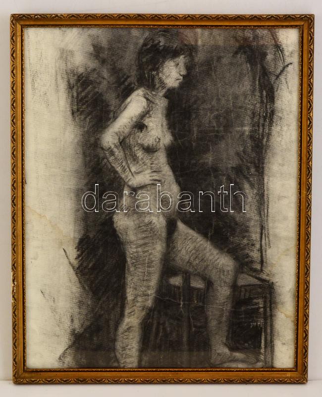 Jelzés nélkül: Női akt. Szén, papír, gyűrődéssel, üvegezett keretben, ...