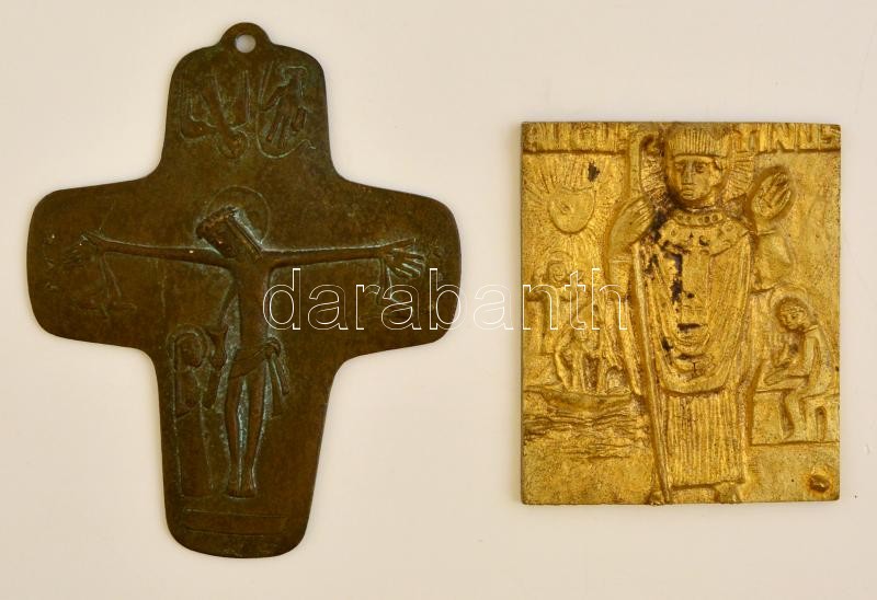 Egino Weinert (1920-2012) 2 db kisplasztikája: feszület, Szt. Ágoston; réz, jelzés nélkül, 9,5×8 ill. 7×6 cm