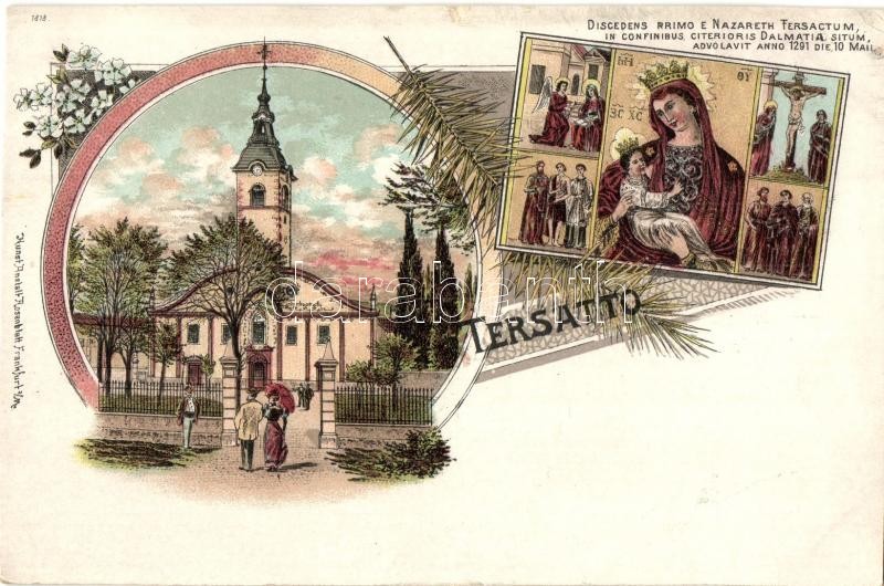 Fiume, Tersatto, Trsat; kegytemplom / church, Kunstanstalt Rosenblatt floral Art Nouveau litho (vágott / cut)