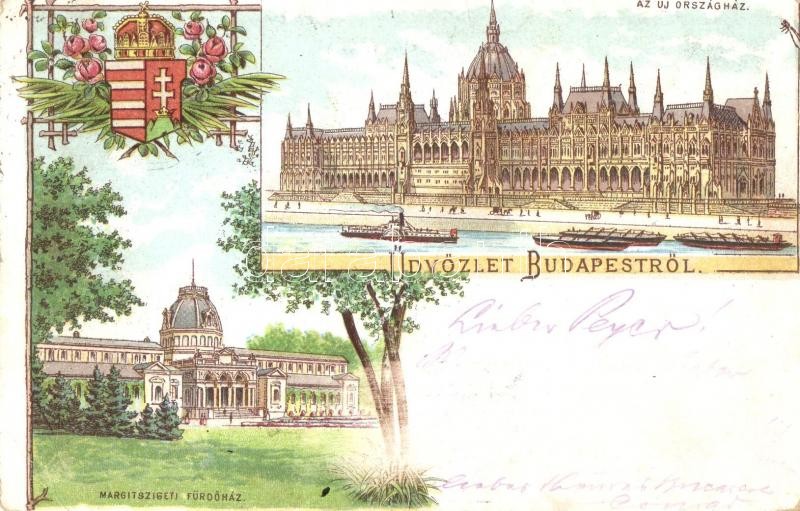 1897 Budapest, Országház, Margitszigeti fürdőház. Címeres litho (EK)