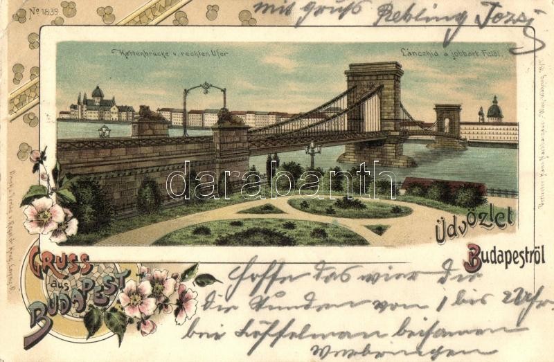 1901 Budapest, Lánchíd a jobb part felől. Regel & Krug floral, Art Nou...