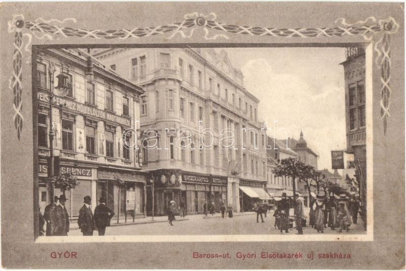 Description: 1918 Győr, Baross út, Győri Elsőtakarék új székháza, Weisz Ferencz női feltöltők nagyáruháza, Spitzer Arnold bútor üzlete. Art Nouveau, Nitsmann József kiadása