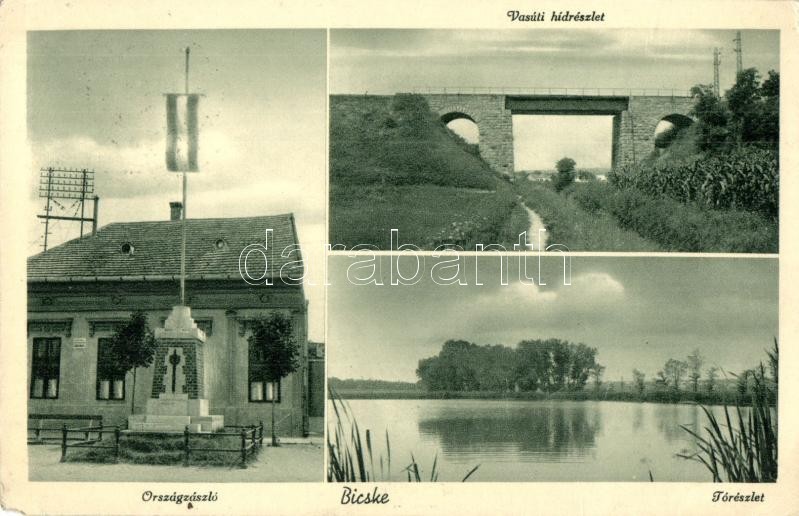 1939 Bicske, Országzászló, Vasúti híd, Tó (EK)