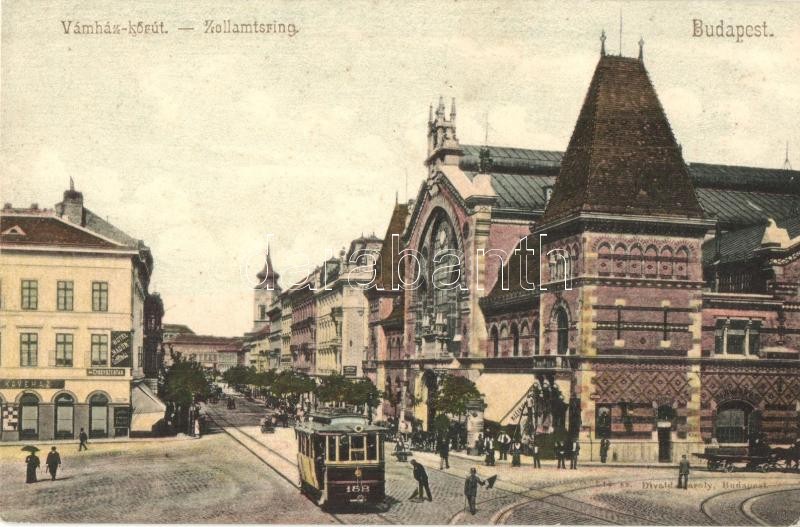 Budapest IX. Vámház körút, villamos, Klein üzlete, vásárcsarnok, gyógyszertár, kávéház, Nándor szálloda
