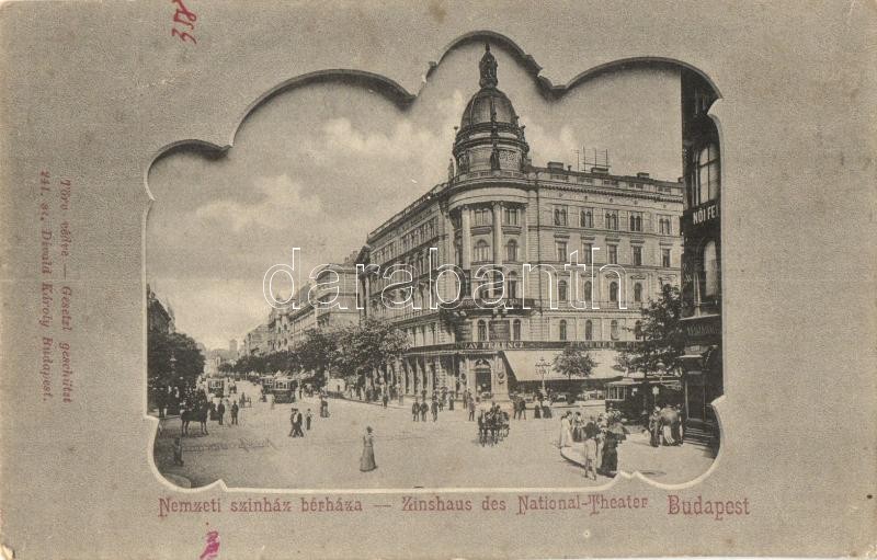 Budapest VIII. Nemzeti színház bérháza, Szikszay Ferenc étterme és kávéháza, villamosok. Divald Károly 241. sz. (EB)