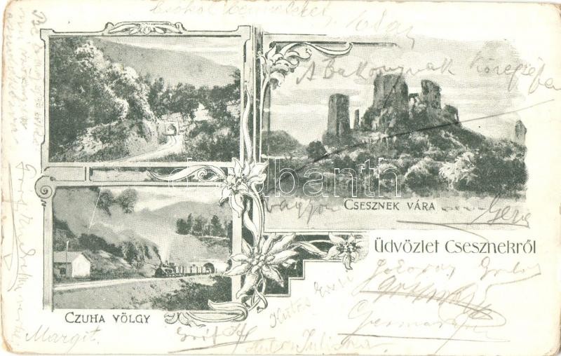 Csesznek, vár, Czuha-völgy gőzmozdonnyal. Art Nouveau, floral (kopott sarkak / worn corners)