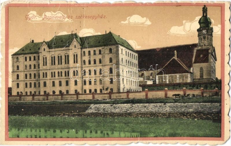 Győr, Papnevelő és székesegyház, H. T. kiadása, (gyűrött / creased)