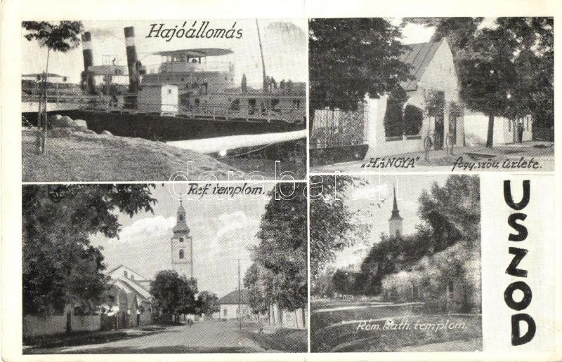 Uszód, Hajóállomás, Hangya fogyasztási szövetkezet üzlete, Református templom, utca. Szombathelyi Foto kiadása (Rb)