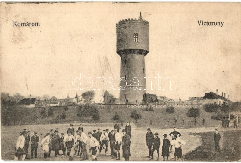 Komárom, Komárno; Víztorony, labdarúgó csapat a sportpályán / water tower, football players on the sports field (fl)