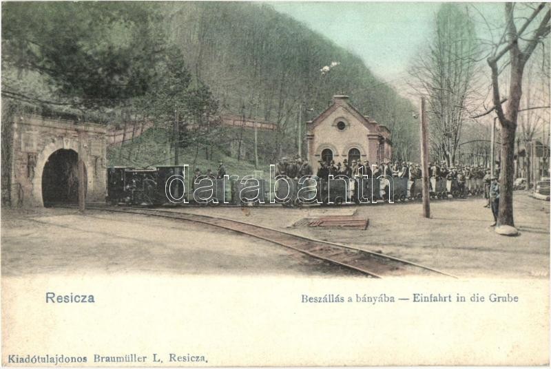 Description: 1905 Resicabánya, Resita; Beszállás a bányába, bányászok csillékben. Braumüller L. kiadása / Einfahrt in die Grube / mine entrance with miners in mine carts