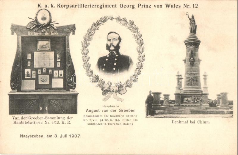 1907 Nagyszeben, Hermannstadt, Sibiu; Cs. és kir. 12. sz. Georg Prinz von Wales hadtest-tüzérezred, August van der Groeben vezérőrnagy és a 4/12-es tarack osztag emlék gyűjteménye, emlékmű Chlumnál / K.u.K. Korpsartillerieregiment Georg Prinz von Wales Nr. 12., August van der Groeben, Van der Groeben-Sammlung der Haubitzbatterie Nr. 4/12. K.R., Denkmal bei Chlum / K.u.K. military artillery regiment and its statue and memorial collection