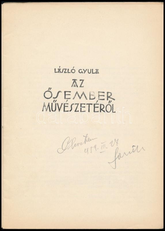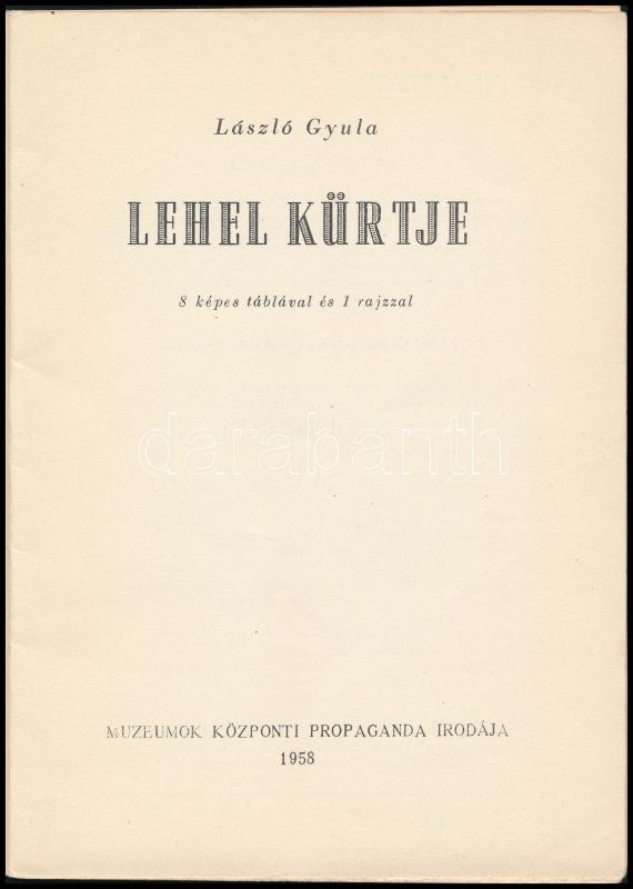 László Gyula 3 műve: Az ősember művészetéről. Bp., é.n., Magyar Nemzeti Múzeum-Történeti Múzeum, 21+1 p. Egészoldalas és szövegközti fekete-fehér illusztrációkkal. Kiadói tűzött papírkötés. Megjelent 1500 példányban. László Gyula: Az avarok hazánkban. [Bp.,1956, Magyar Nemzeti Múzeum], 31+1 p. Egészoldalas és szövegközti fekete-fehér illusztrációkkal. Kiadói tűzött papírkötés, ceruzás aláhúzásokkal. László Gyula: Lehel kürtje. Bp.,1958, Múzeumok Központi Propaganda Irodája, 17 p.+ 6 t. Egészoldalas és egy kihajtható fekete-fehér illusztrációval. Második kiadás. Kiadói papírkötésben, a hátsó borítón bejegyzésekkel. Megjelent 2000 példányban.
