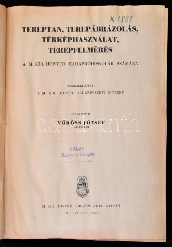 Vörös József: Tereptan, terepábrázolás, térképhasználat, terepfelmérés. Budapest, 1943, M. Kir. Honvéd Térképészeti Intézet, 346 p. + XV melléklet. Kiadói félvászon-kötés, viseltes, kopottas borítóval, az elülső borító és a lapok hullámosak. Dr. Keszi Kovács László (1908-2012) néprajzkutató, az Erdélyi Tudományos Intézet, gróf Teleki Pál Tudományos Intézet, a kolozsvári M. Kir. Ferenc József Tudományegyetem tanárának, MTA Néprajzi Kutató Csoportjának tudományos főmunkatársának beragasztott névjegykártyájával.