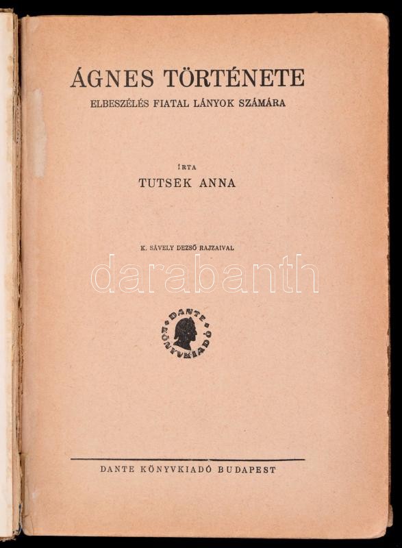 Tutsek Anna: Ágnes története. K. Sávely Dezső rajzaival. Bp., é.n., Da... https://www.darabanth.com/en/324-Online-auction/324.0/Books/Books-Other-rarities~1000018/Tutsek-Anna-Agnes-tortenete-K-Savely-Dezso-rajzaival-Bp-en-Dante-Horvanyszky-Viktor~II1691845