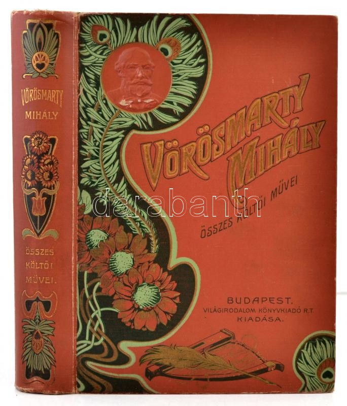 Vörösmarty Mihály összes költői művei. Költemények, költői elbeszélések, drámák, pályalombok, Shakespeare fordítások. Sajtó alá rendezte és életrajzzal ellátta Endrei Zalán. A színes műmellékletek Geiger Richárd munkái. Bp.,1907, Világirodalom,(Globus-ny.), VIII+526 p.+4 t. Kiadói aranyozott, festett, egészvászon-kötés, Dörner és Heimberg-kötés, kissé kopottas borítóval, egy kijáró illusztrációval.