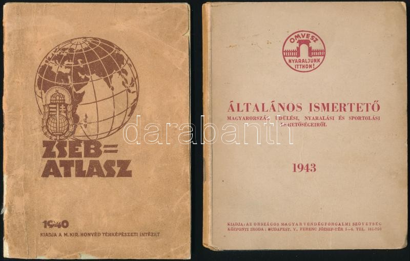 1940-1943 Vegyes könyvtétel, 2 db: Zsebatlasz. Bp., 1940, M. Kir. Honvéd Térképészeti intézet. Kiadói papírkötés, kopott, javított borítóval. Általános ismertető. Magyarország üdülési, nyaralási és sportolási lehetőségeiről. Bp.,1943, Országos Magyar Vendégforgalmi Szövetség. Kiadói papírkötés.