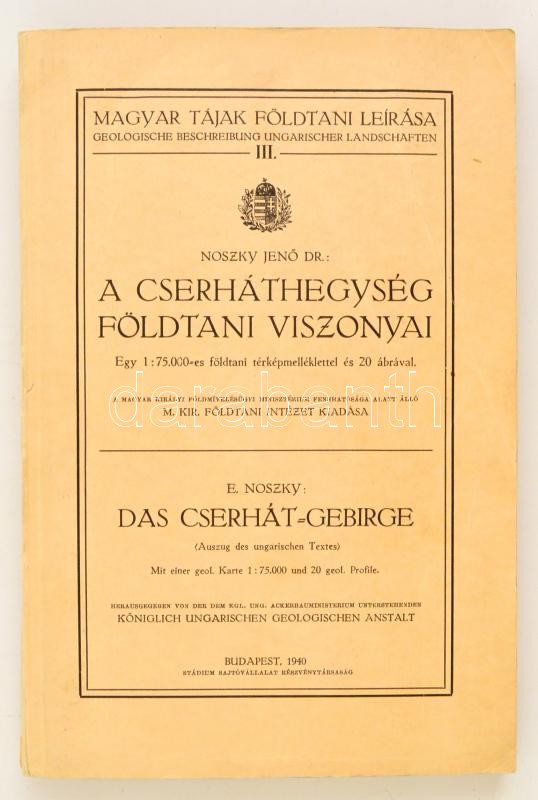 Dr. Noszky Jenő: A Cserháthegység földtani viszonyai. Magyar Tájak Földtani Leírása III. kötet. Bp., 1940, M. Kir. Földtani Intézet, (Stádium-ny.), 283+1+5 t. (4 kihajtható)+IV p+1 színes kihajtható térképmelléklet: A cserhát-hegység földtani térképe, felvette: id. Noszky Jenő dr., 83x89 cm. Kiadói papírkötés, kis szakadással a borítón.