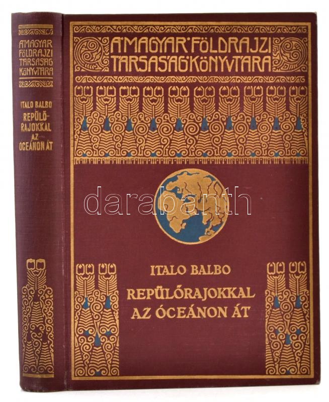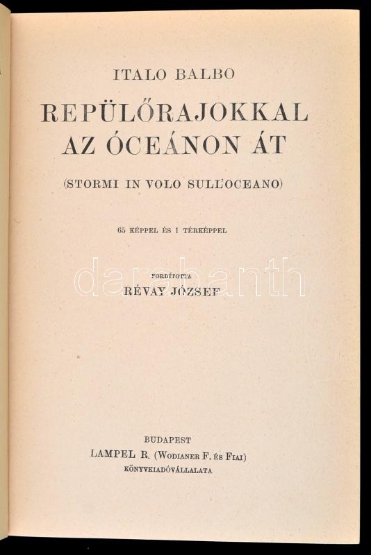 Italo Balbo: Repülőrajokkal az óceánon át. Fordította Révay József. Magyar Földrajzi Társaság Könyvtára. Bp.,é.n,Lampel R. (Wodianer F. és Fiai). Egészoldalas fekete-fehér fotókkal illusztrálva. Kiadói aranyozott egészvászon sorozatkötésben, jó állapotban.